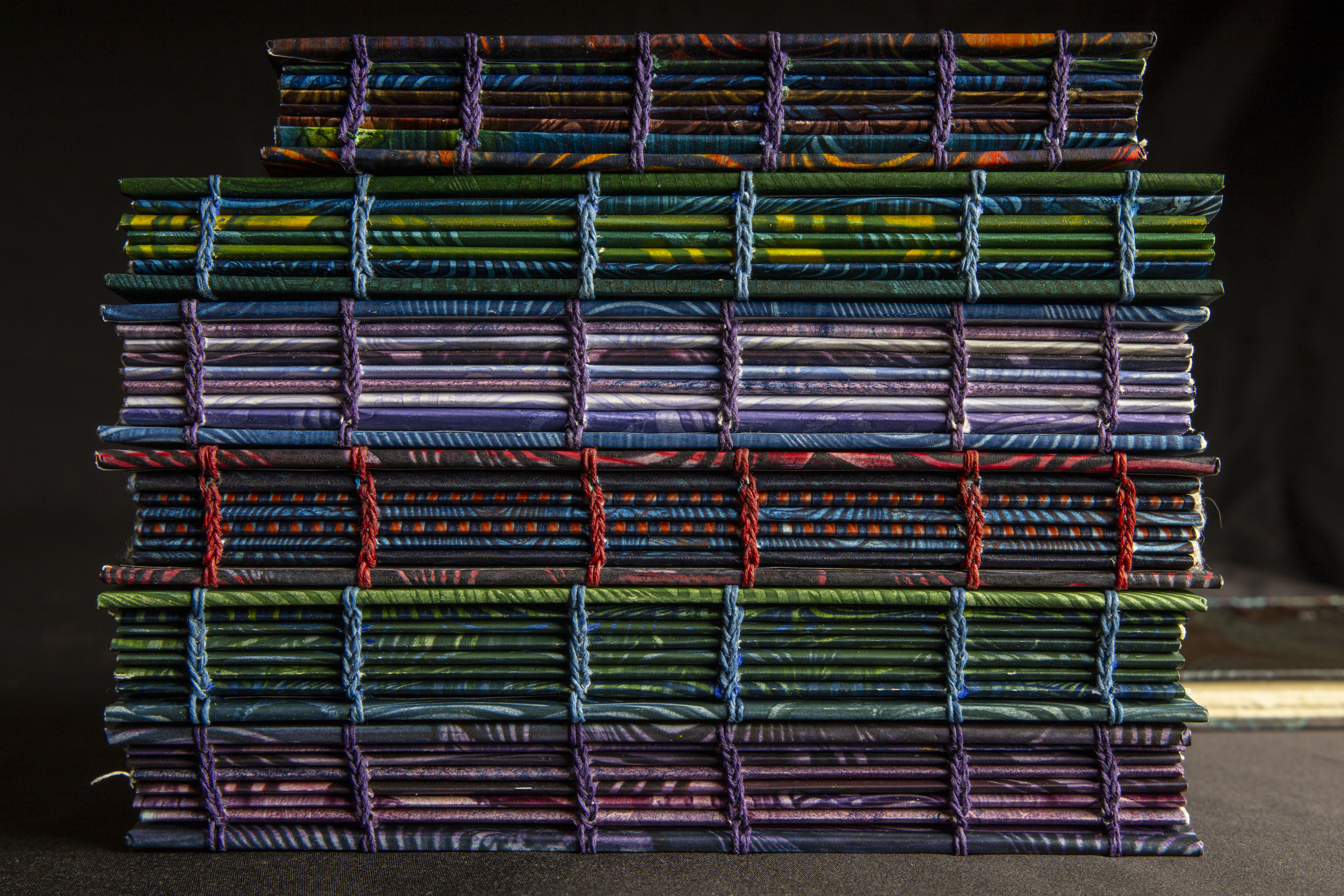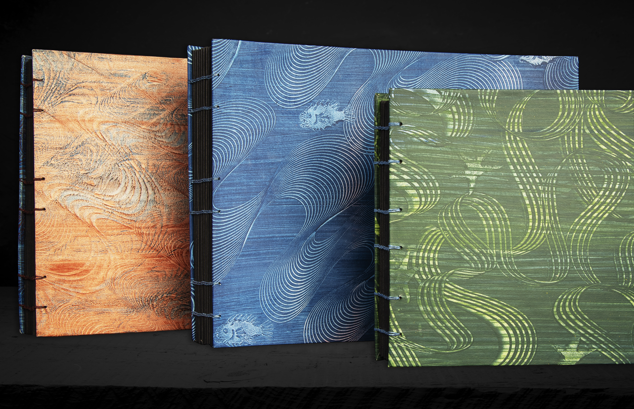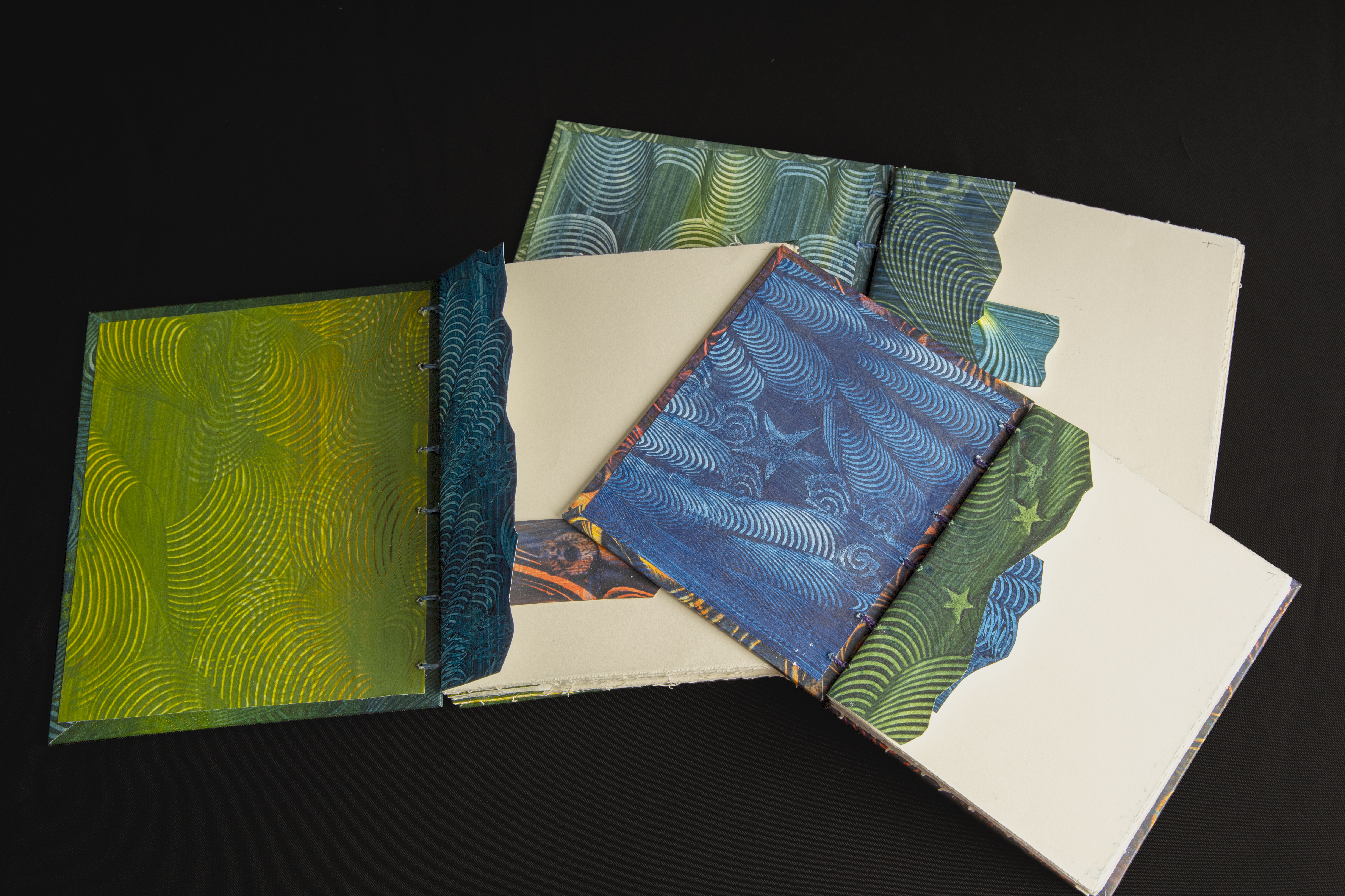 My books begin with the process of making paste papers. I first carve stamps of birds, insects, fish, stars and such and cut combs from plumbing gasket material. I then cook a paste with wheat starch which is later mixed with PVA glue and pigments. These tools and paints come together to create layers of color and pattern in a process called paste painting. Most of the papers have at least two layers of color and pattern which interact to achieve moire effects. Often a third middle layer is added with metallic oil paint sticks to introduce a subtle glimmer of iridescence on the surface. These papers are used to create handmade journals and photo albums using a variety of structures including Six Needle Coptic, Secret Belgium Binding, Accordion, Japanese Ribbon Binding and Pamphlet Bindings. These non-adhesive bindings are sewn with archival linen thread. The text pages are archival, acid free papers such as Canson Mi-Teintes and Mohawk Superfine. The paste papers are used for the book covers, end pages and text block covers.