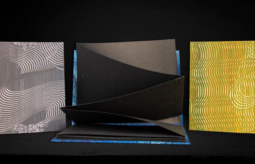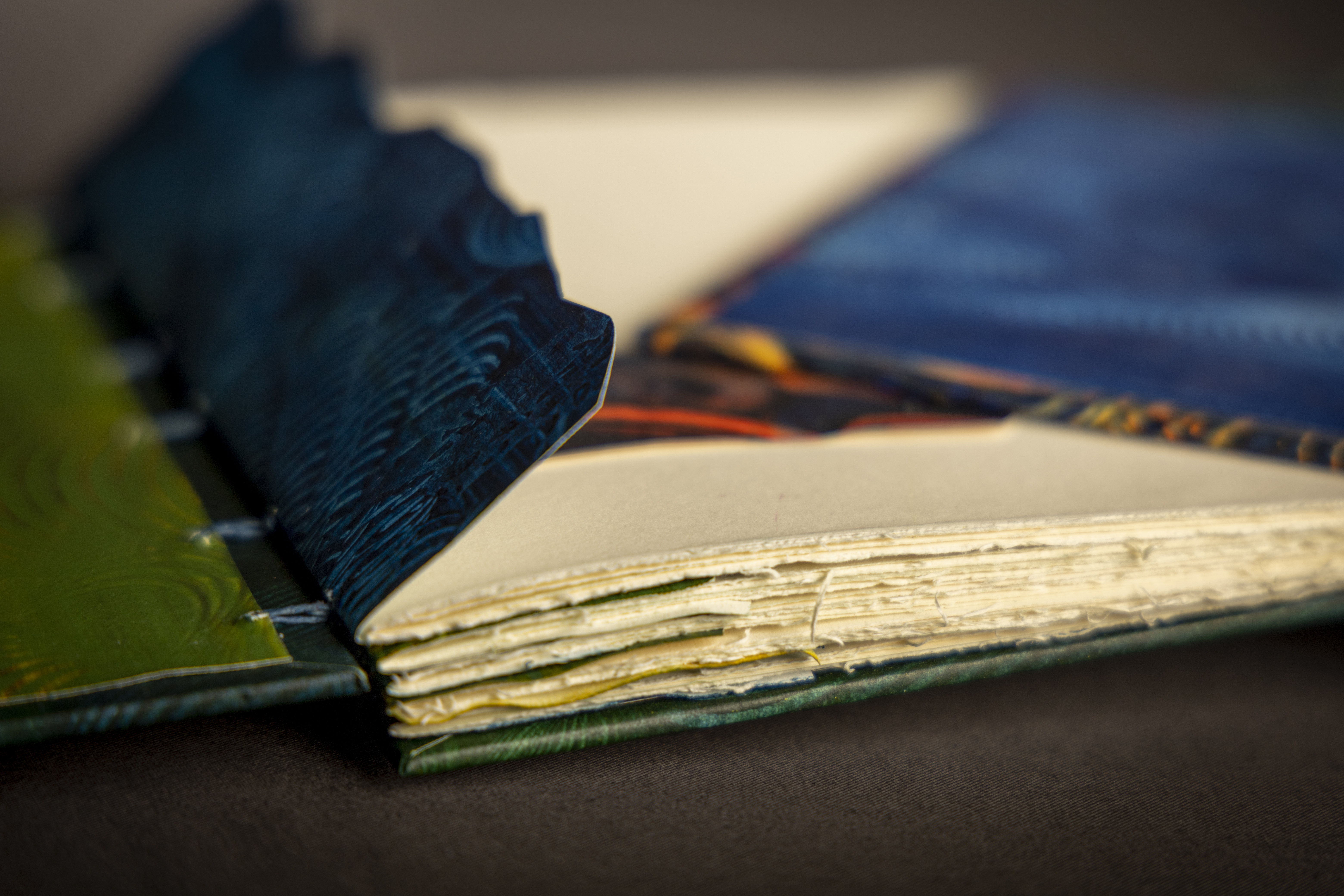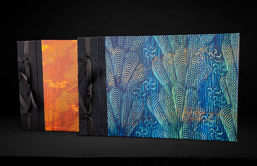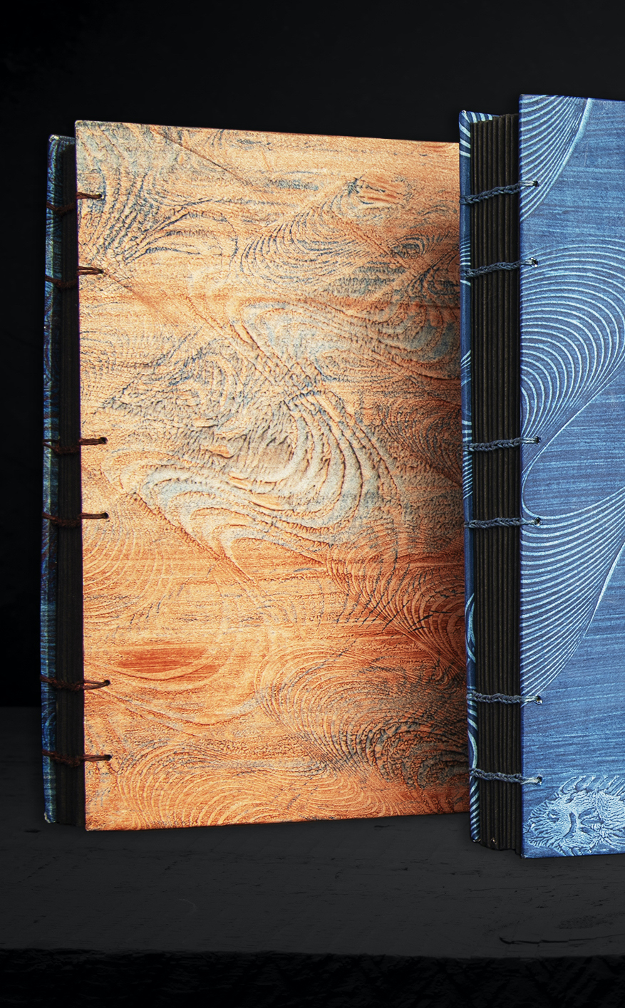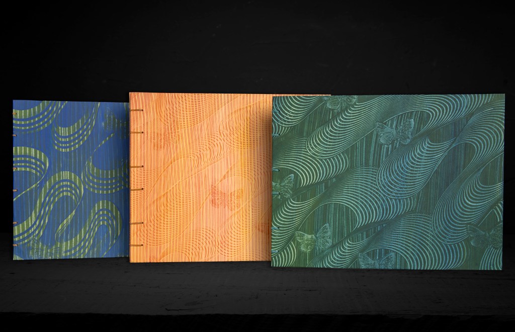 My books begin with the process of making paste papers. I first carve stamps of birds, insects, fish, stars and such and cut combs from plumbing gasket material. I then cook a paste with wheat starch which is later mixed with PVA glue and pigments. These tools and paints come together to create layers of color and pattern in a process called paste painting. Most of the papers have at least two layers of color and pattern which interact to achieve moire effects. Often a third middle layer is added with metallic oil paint sticks to introduce a subtle glimmer of iridescence on the surface. These papers are used to create handmade journals and photo albums using a variety of structures including Six Needle Coptic, Secret Belgium Binding, Accordion, Japanese Ribbon Binding and Pamphlet Bindings. These non-adhesive bindings are sewn with archival linen thread. The text pages are archival, acid free papers such as Canson Mi-Teintes and Mohawk Superfine. The paste papers are used for the book covers, end pages and text block covers.